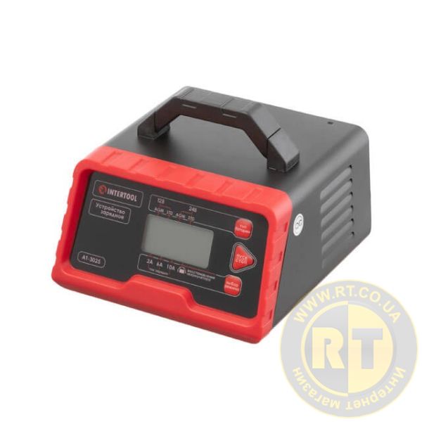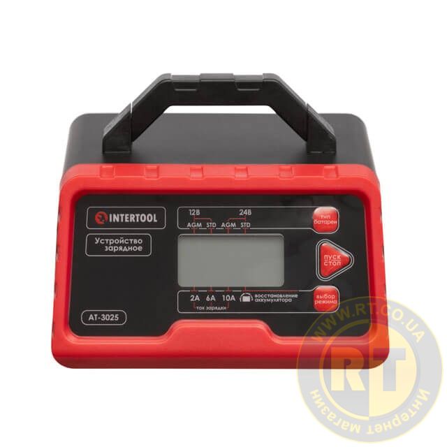 Зарядний пристрій INTERTOOL AT-3025 - інтелектуальний, керується мікропроцесором та системою з багатоступеневим циклом заряджання. Пристрій підходить для всіх типів батарей: 12 В легкових автомобілів та 24 В вантажівок, а також для акумуляторів катерів, гідроциклів, сільськогосподарської техніки, промислового та побутового обладнання.
