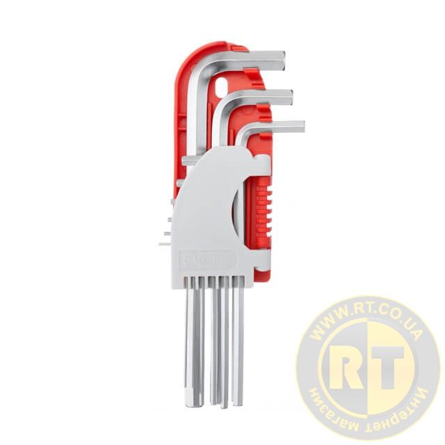 9 метричних шестигранних ключів розміщуються у пластиковому тримачі з маркуванням розміру, набір зручно зберігати, ключі не губляться, також їх можна покласти у ящик до інших інструментів.