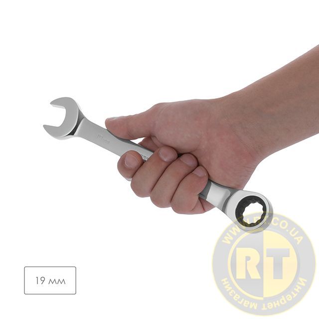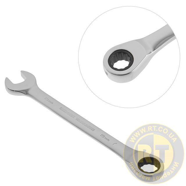 Комбінований ключ з тріскачкою розміром 19 мм призначений для монтажу та демонтажу різьбових з'єднань гайок та болтів.у