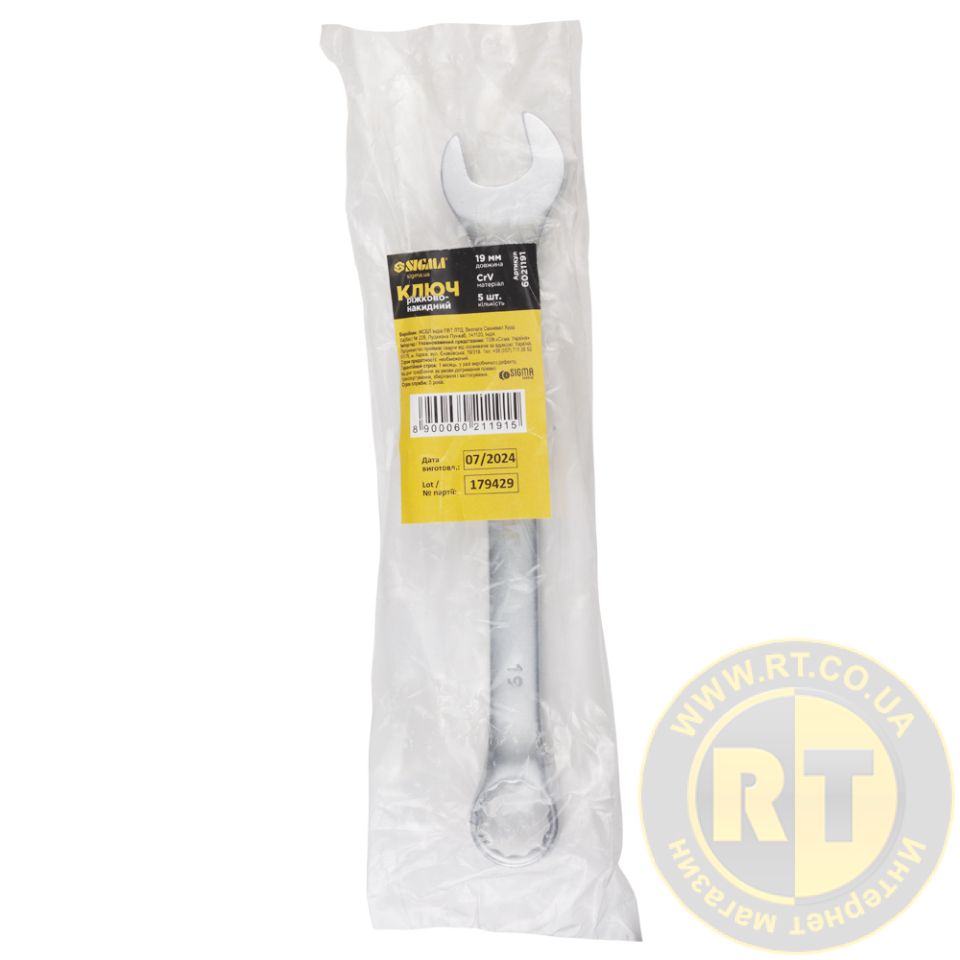 Ключ ріжково-накидний 19мм CrV satine SIGMA (6021191) виготовлений з хромванадієвої сталі, має антикорозійне покриття з хрому, матова поверхня (сатинова).