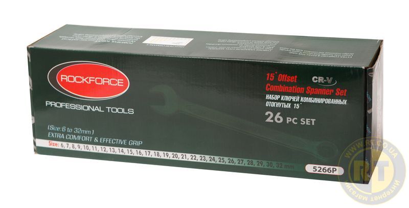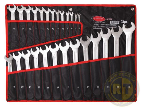 Код товару: 17102 , Склад: Набір ключів комбінованих RF-5266P: 15грд., 26ін. (6-30, 32мм), на полотні ROCKFORCE /1
