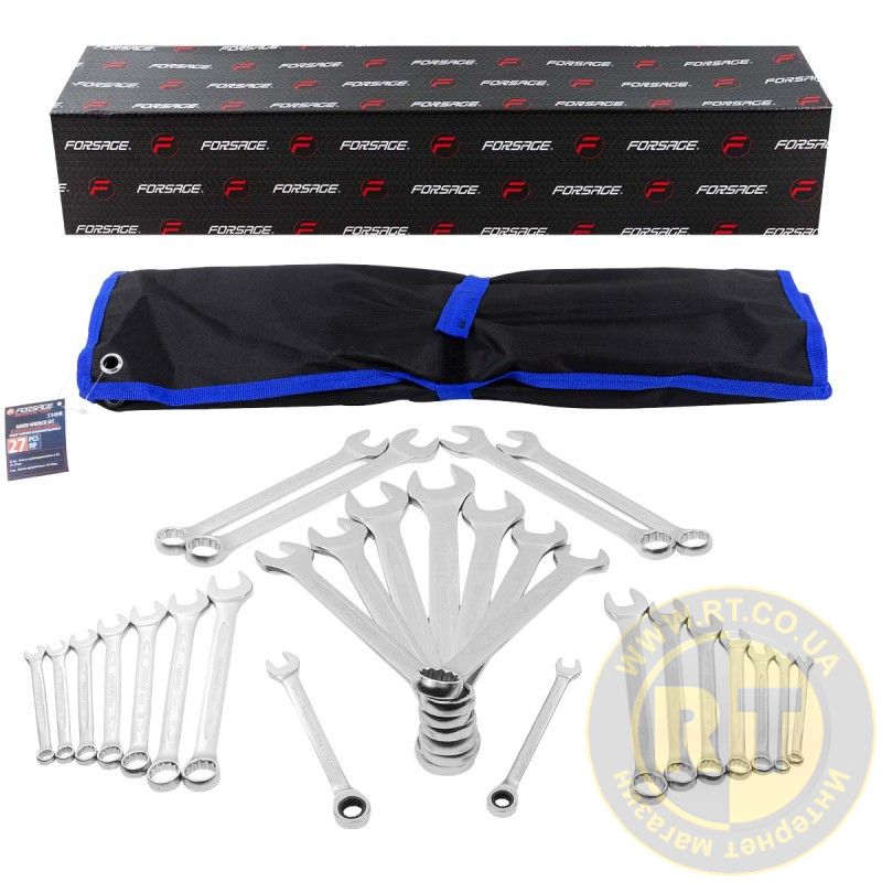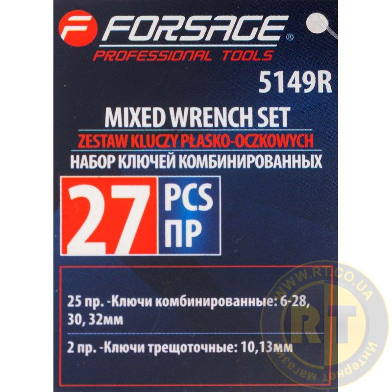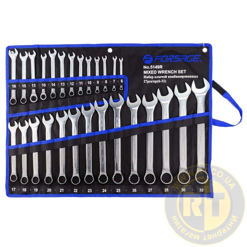 Набір ключів комбінованих 27 предметів (6-28,30,32 мм+ключі тріскачкові 10,13 мм) на полотні Forsage FORCEKRAFT F-5149R