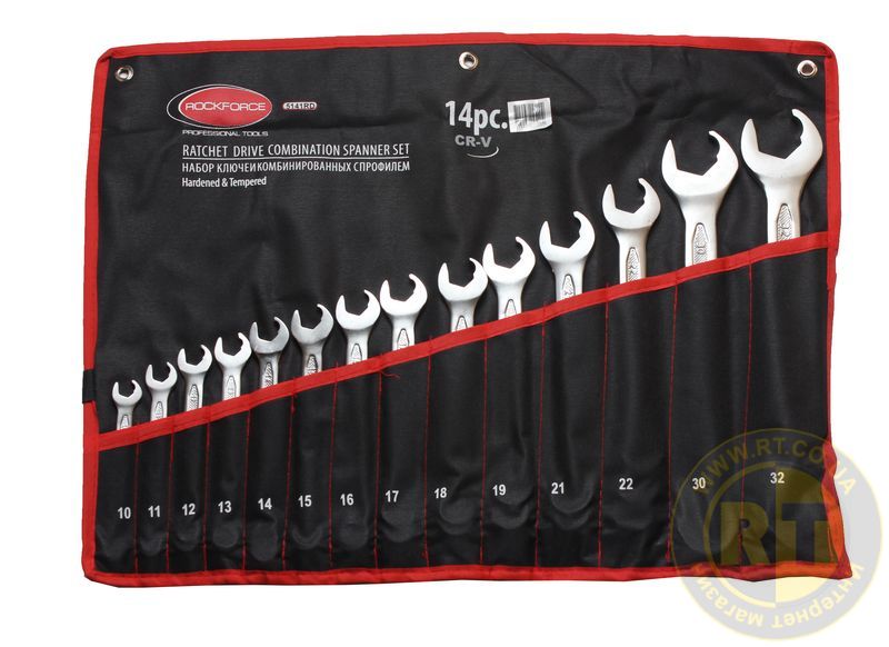 Код товару: 17104 , Склад: Набір ключів комбінованих з профілем "Ratchet Drive"-"швидкий ключ", 14ін. (10-19, 21, 22, 30, 32мм), на полотні ROCKFORCE /1