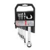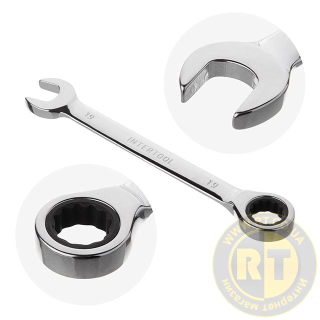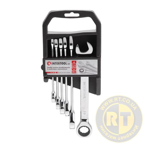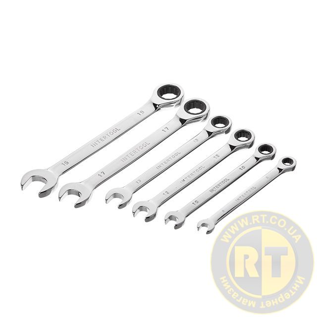 Набір ріжково-накидних ключів з тріскачкою INTERTOOL XT-1301 містить найпопулярніші розміри: 8, 10, 12, 13, 17, 19 мм, що дозволяє підібрати необхідний ключ під будь-які завдання для монтажу і демонтажу різьбових з'єднань гайок і болтів.