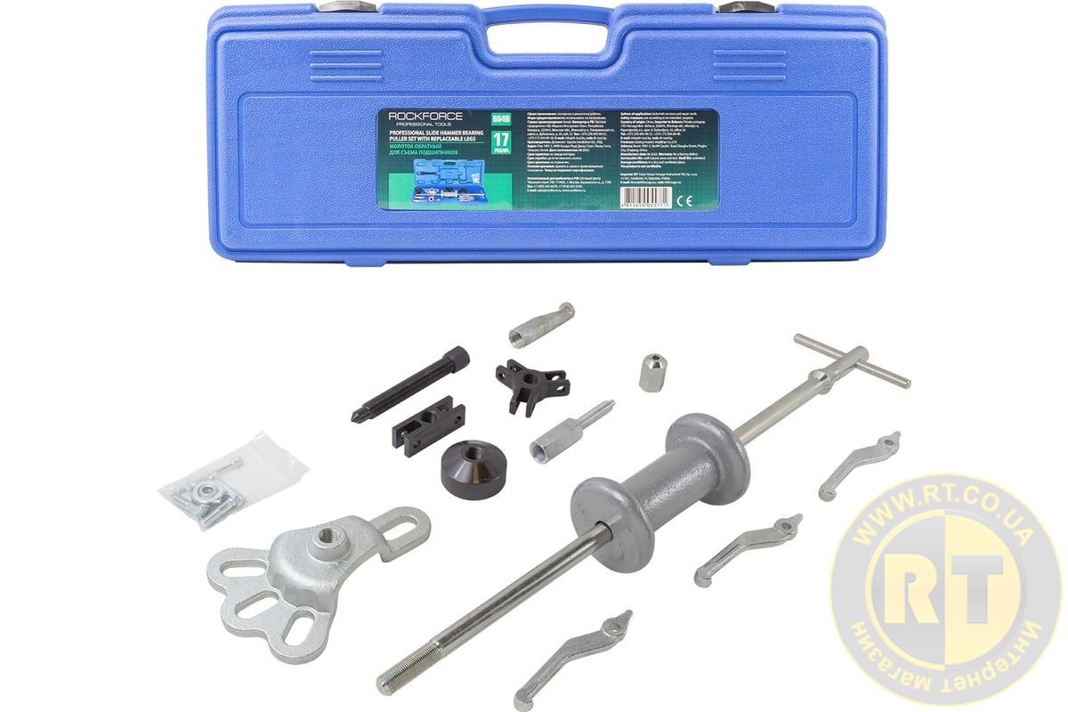 Молоток зворотний для знімання підшипників у наборі зі змінними лапами (17 предметів) у кейсі. ROCKFORCE FORCEKRAFT RF-664B