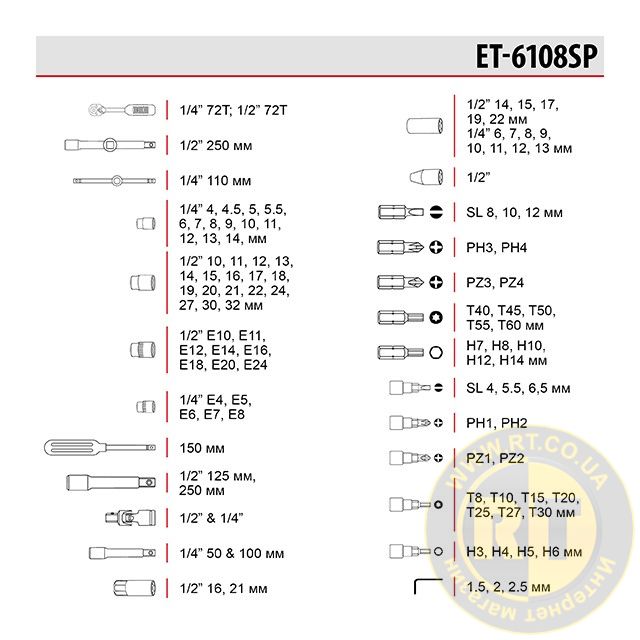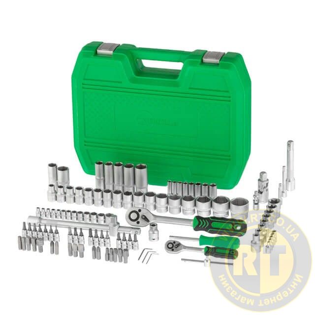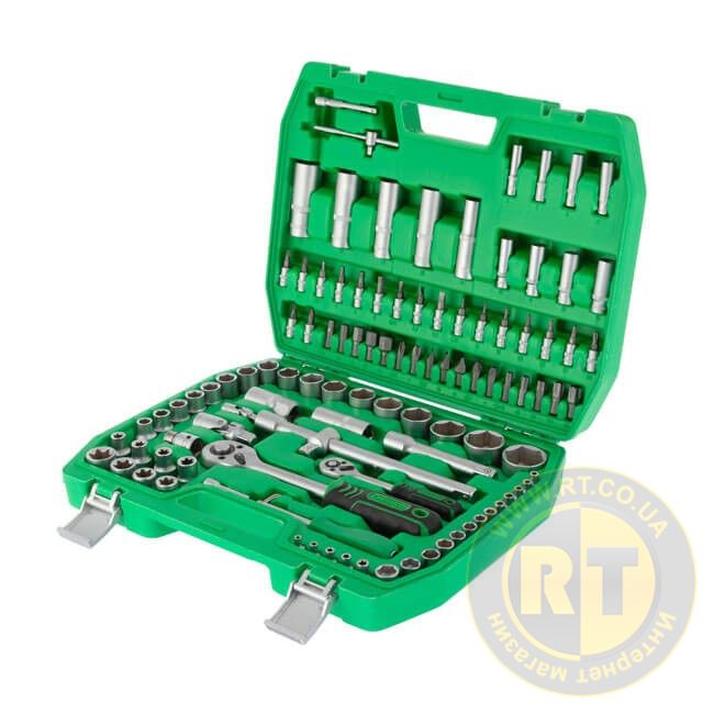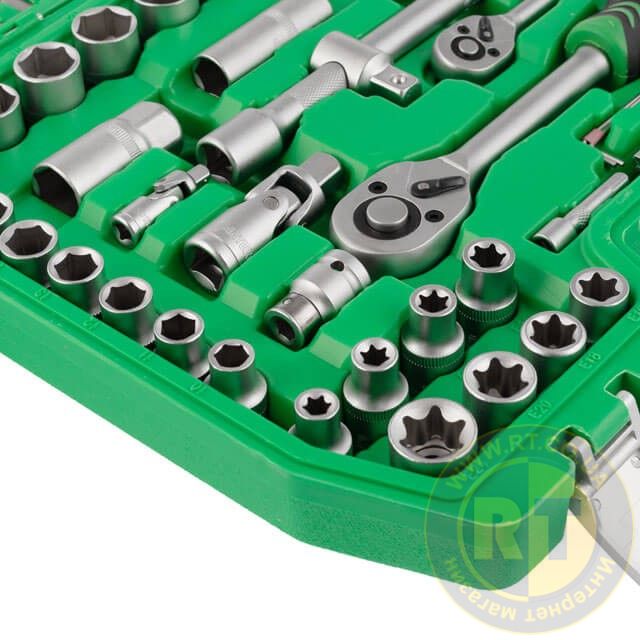 Набір включає 108 елементів для вирішення будь-якого завдання на відкручування, закручування кріплень. Різноманітність торцевих головок у наборі дозволяє виконувати переважну більшість завдань з ремонту автомобіля, а також техніки.