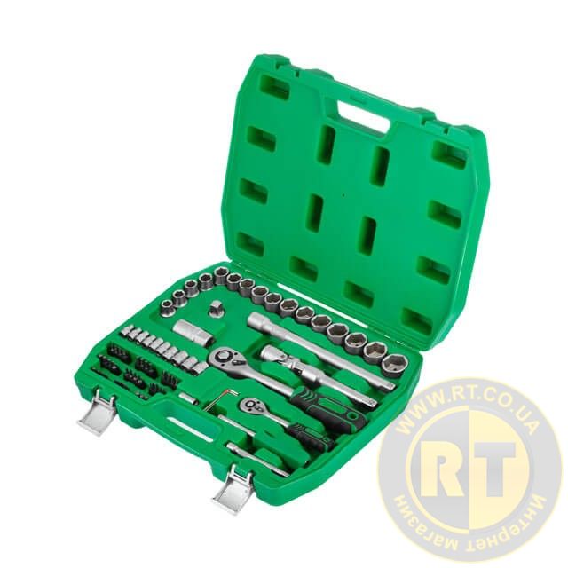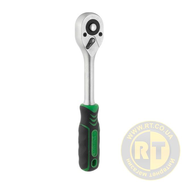 У наборі дві тріскачки з посадковими квадратами 1/2” та 1/4", з реверсом, кнопкою для скидання та фіксації головок. Храповик на 72 зуби забезпечує м'якість ходу і дозволяє працювати в умовах обмеженого простору. Ручка тріскачки двокомпонентна з гумовою накладкою в місці хвату для кращої фіксації в руці, не ковзає і не випадає під час роботи.