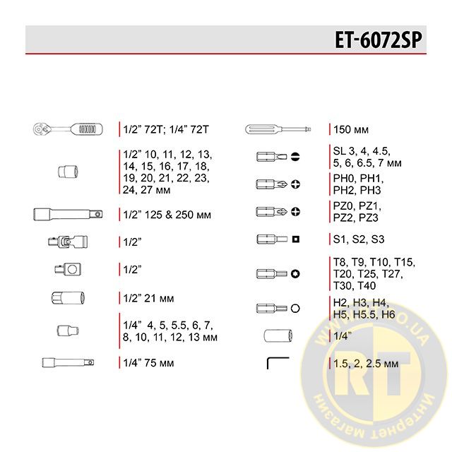 У комплекті вороток, подовжувачі, кардан, необхідні для відкручування гайок, болтів та шпильок у глибоких колодязях двигунів або в місцях, де складно їх дістати. Головка для зняття свічок запалювання (21 мм) дозволяє замінити свічки на автомобілі будь-якого виробника, включаючи країни ЄС.