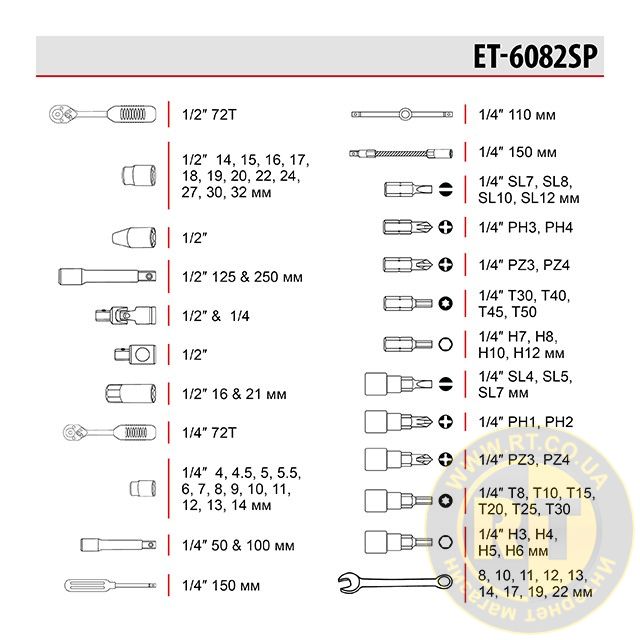 У набір включені всі необхідні інструменти для роботи з автомобілем, мототехнікою, велотехнікою тощо. Основою комплекту є шестигранні головки від 4 до 32 мм, 9 ріжково-накидних ключів підходять для виконання різнопланових робіт на закручування та відкручування кріплень.