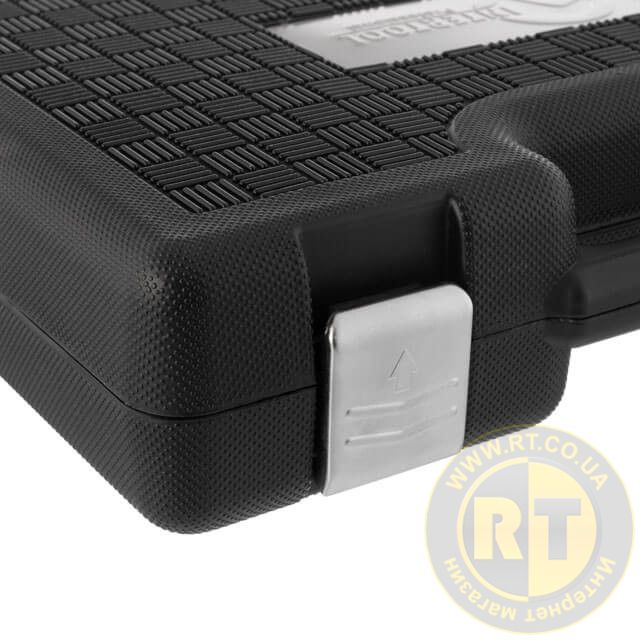 Кейс виготовляється з міцного пластику з металевими замками. Всі інструменти щільно зафіксовані на своїх посадкових місцях з маркуванням розміру головок. Наявність поролонового прошарку не дозволяє висипатися вмісту набору під час транспортування.