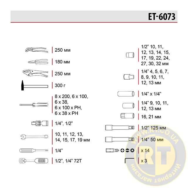 Головна особливість набору в його комплектації. Основою комплекту є дві тріскачки з приводом 1/2" та 1/4", шестигранні головки для виконання різнопланових робіт на закручування та відкручування кріплень. Наявність подовжувачів та кардана полегшать роботу у важкодоступних місцях.