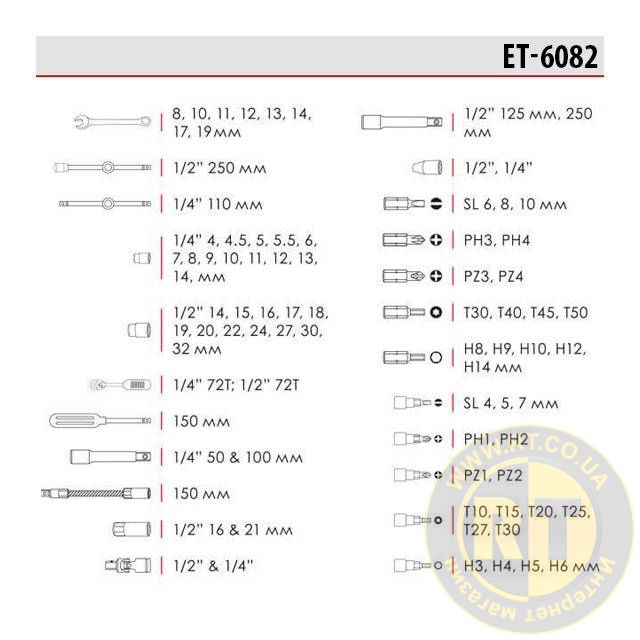 Набір інструментів, проф., 1/2" + 1/4", Cr-V, 82 од., головки: 4-32 мм, біти 33 од., ключі: 8-19 мм, кейс INTERTOOL ET-6082