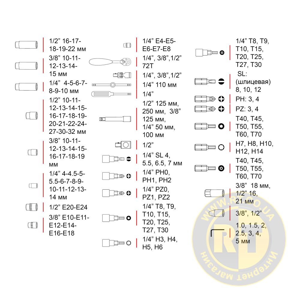- Головка шестигранна торцева 1/2" 17 од.: 10, 11, 12, 13, 14, 15, 16, 17, 18, 19, 20, 21, 22, 24, 27, 30, 32 мм;