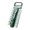 Головки та тріскачка надійно фіксуються на тримачі–переносці. Велика ручка на корпусі дозволить зручно транспортувати весь набір або підвісити його на цвях. Комплект не займе багато місця на полиці чи у багажнику.