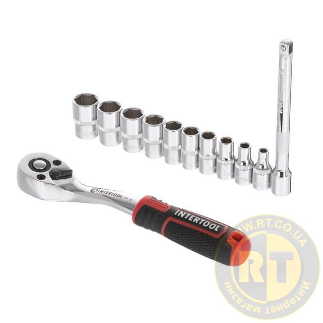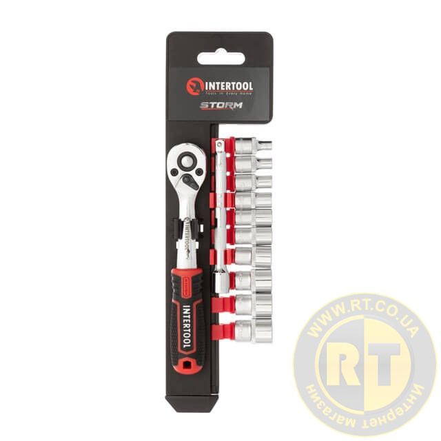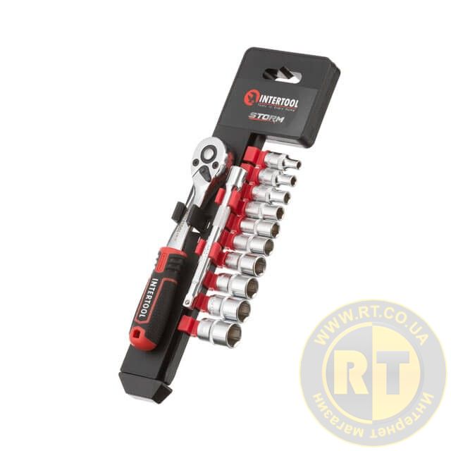 Набір головок STORM, 1/4", Cr-V, 12 од., головки: 4-13 мм, тріскачка 72 зуби, подовжувач 100 мм INTERTOOL ET-8012