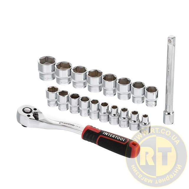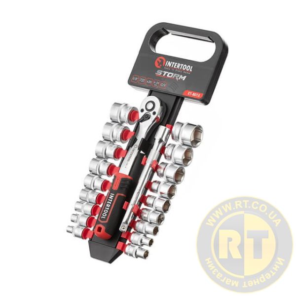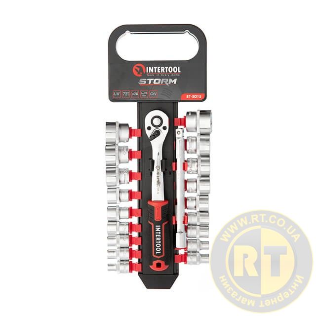 Набір головок STORM, 3/8", Cr-V, 20 од., головки: 6-24 мм, тріскачка 72 зуби, подовжувач 150 мм INTERTOOL ET-8015
