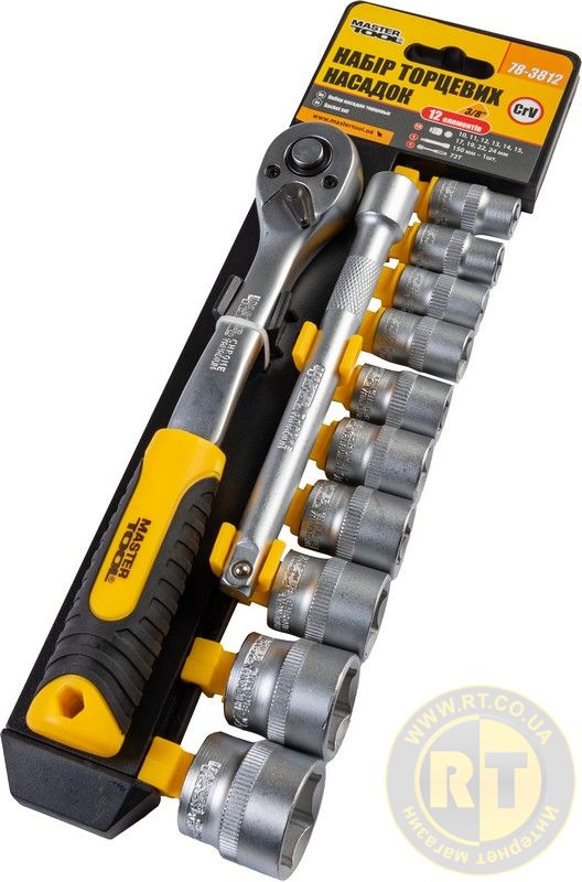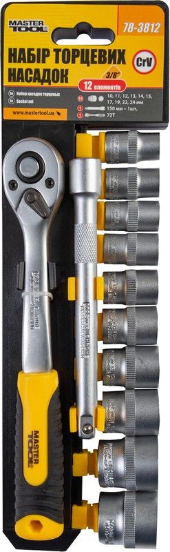 Набір головок торцевих 6-гранних ⅜" 10-24 мм з тріскачкою 72 зубця подовжувач CrV 12 шт MASTERTOOL 78-3812