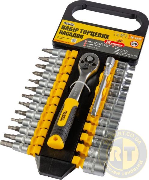 Набір головок торцевих 6-гранних ¼" 4-14 мм TORX PH HEX SL з тріскачкою 72 зубця подовжувач CrV 28 шт MASTERTOOL 78-1428