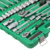 У наборі дві тріскачки з посадковими квадратами 1/2” та 1/4", з реверсом, кнопкою для скидання та фіксації головок. Храповик на 72 зуби забезпечує м'якість ходу і дозволяє працювати в умовах обмеженого простору. Ручка тріскачки двокомпонентна з гумовою накладкою в місці хвату для кращої фіксації в руці, не ковзає й не випадає під час роботи.