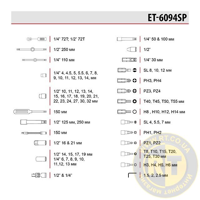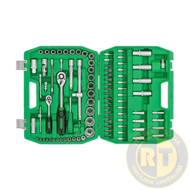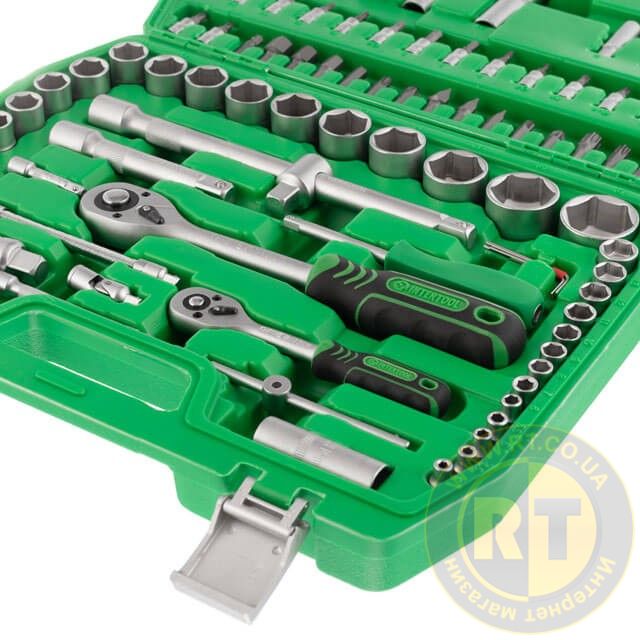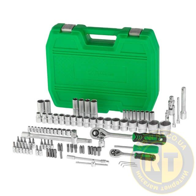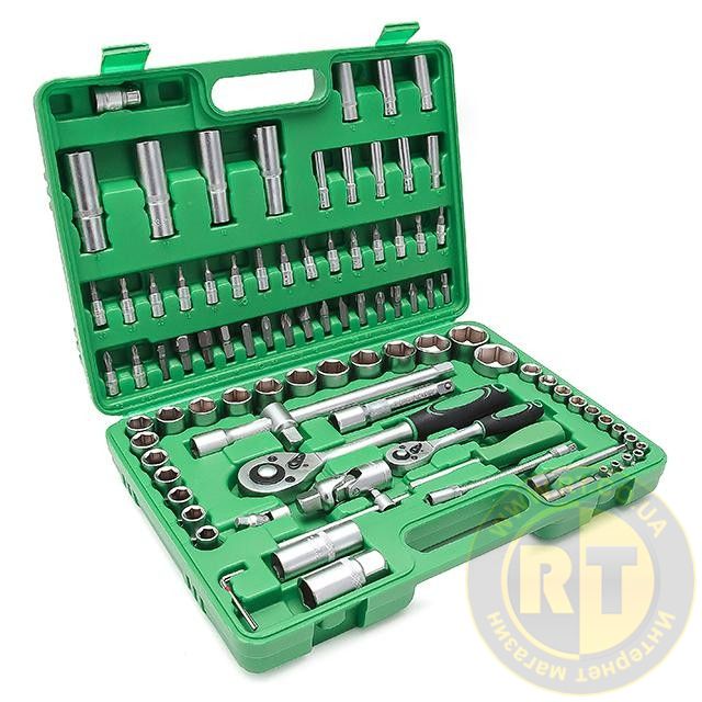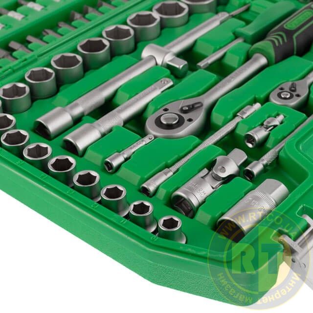 Набір включає 94 елементи для вирішення будь-якого завдання на відкручування, закручування кріплень. Різноманітність торцевих головок у наборі дозволяє виконувати переважну більшість завдань для ремонту автомобіля, а також техніки.