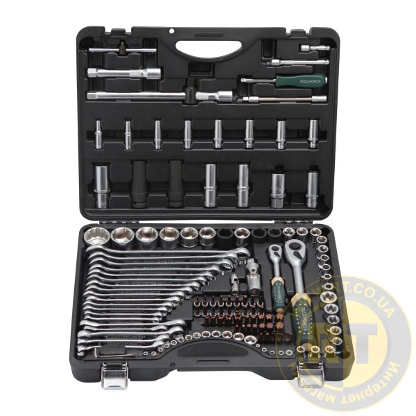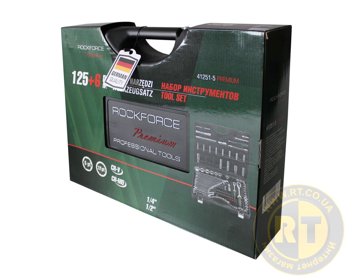 Набір інструментів RF-41251-5 PREMIUM, 1/4 та 1/2 дюйма, CrV, включає 125+6 предметів, у тому числі тріскачки, та призначений для роботи в гаражі, а також домашнього ремонту. У комплекті інструменти для монтажу та демонтажу різьбових з'єднань. Ворота, подовжувачі та карданні шарніри полегшують маніпуляції в обмежених умовах. Для зберігання та транспортування передбачений кейс із удароміцного пластику з надійними металевими замками.
