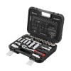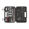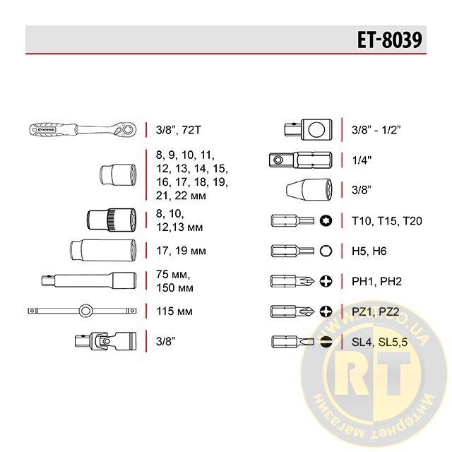 Набір із комплектацією з 39 одиниць має тріскачку з посадковим квадратом 3/8", набір шестигранних головок від 8 до 22 мм, головки середньої довжини 8-13 мм, а також дві подовжені головки на 17 та 19 мм для роботи з кріпленнями у глибоких колодязях двигунів.