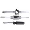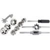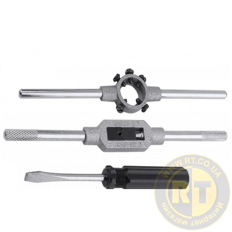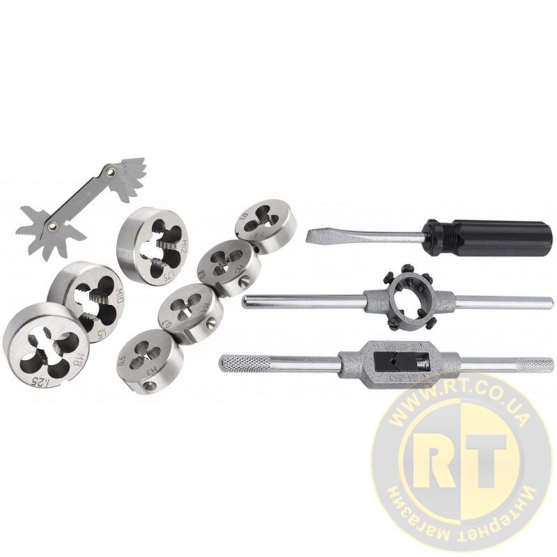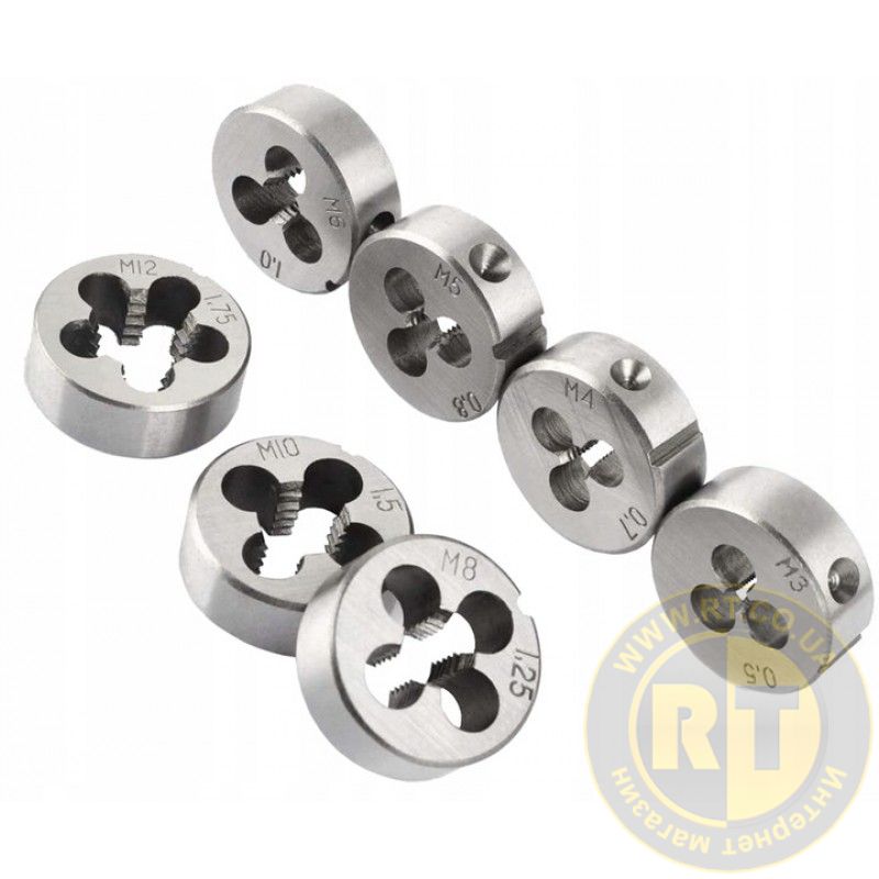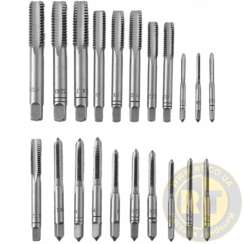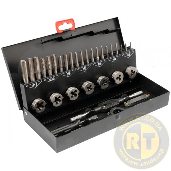 21 шт. - Мітчики: М3 * 0,7 - 3 шт М4 * 0,7 - 3шт М5 * 0,8 - 3шт М6 * 1,0 - 3 шт М8 * 1,25 - 3шт М10 * 1,5 - 3 шт М12 * 1,75 - 3шт 7 шт - Плашки: M3 * 0. M6*1.0, M8*1.25, M10*1.5, M12*1.75 1 шт – Плашкотримач 25мм – 0/D 1шт – Мітчикоутримувач М3-М12 1 шт – Викрутка 1 шт - Різьбомір