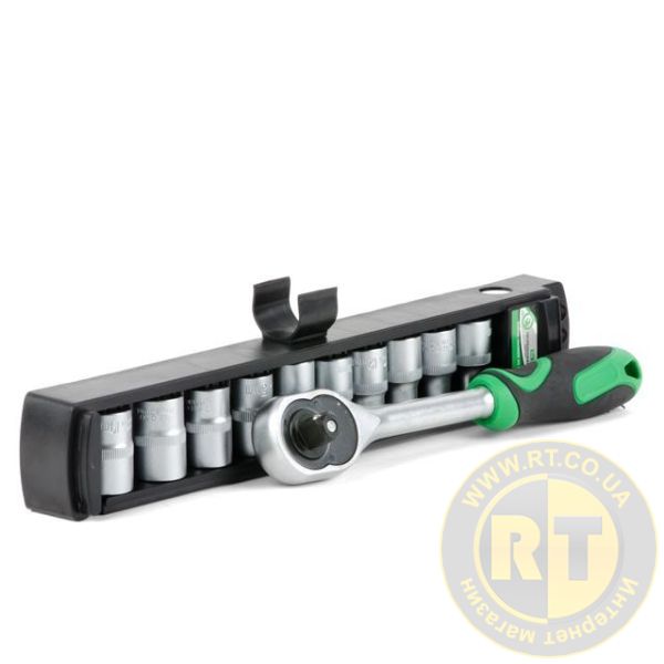 Головки та тріскачка надійно фіксуються на тримачі–переносці. Велика ручка на корпусі дозволить зручно транспортувати весь набір або підвісити його на цвях. Комплект не займе багато місця на полиці чи у багажнику.