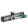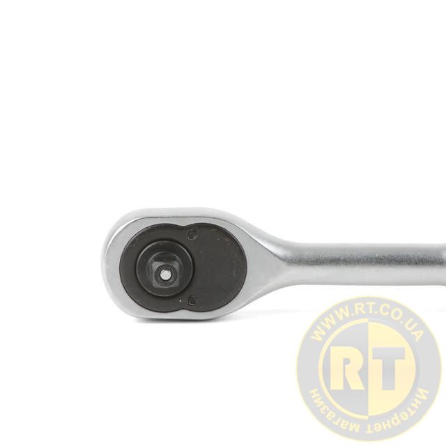 Тріскачка на 72 зуби з плавним ходом, швидким скиданням та фіксацією головок. Дозволяє дістати до кріплень у важкодоступних місцях. Руків’я тріскачки двокомпонентне, завдяки чому не ковзає у руках та гарантує максимум зручності в роботі.