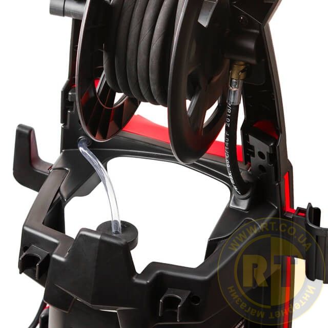 Мийка має котушку для зберігання 5-ти метрового шланга з безпосереднім його підключенням до системи циркуляції води. Також передбачений бічний тримач для зберігання мережевого дроту у згорнутому вигляді.