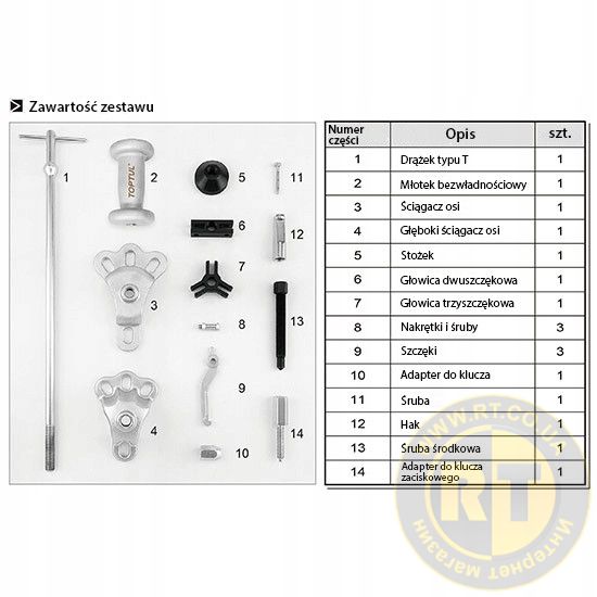 Особливості: набір найчастіше використовуваний як знімач півосі, сальників, підшипників. Призначений для багатоцільових робіт і має 8-функціональний вузол: зовнішній 3-х захватний знімач, внутрішньої 3-х захватний знімач, зовнішнього 2-х захватний знімач, внутрішньої 2-х захватний знімач, адаптера під ручний інструмент, знімач гачок, знімач задньої осі.