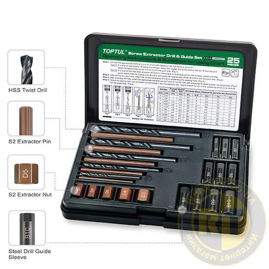 Набір TOPTUL JGEW2501 спеціально розроблений для ефективного видалення зірваних або зламаних болтів, гвинтів та шпильок. Унікальні екстрактори з канавками забезпечують надійне захоплення зламаних елементів при вбиванні їх у попередньо просвердлений отвір.