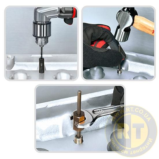 Набір підходить для вилучення зламаних гвинтів та шпильок з різьбленням від M5 до M16 (3/16" до 5/8"). Всі компоненти компактно розміщені у пластиковому кейсі розміром 199x134x34 мм для зручного зберігання та транспортування.