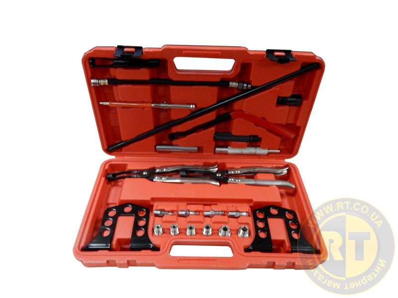 Використовується для заміни клапанних пружин та напрямних втулок двигуна. Набір підходить для 8, 16 і 24 клапанних двигунів. Зубчасті подовжені губи запобігають прослизу. Підходять для глибоко розташованих олійних ковпачків. Рекомендується для професійного використання. Набір підходить для обслуговування більшості вітчизняних та імпортних автомобілів. Розсухарювач призначений для стиснення пружин клапанів на знятій головці блоку циліндрів, так і прямо на двигуні. Працюючи з рассухаривателем знадобиться підведення стисненого повітря. Підходить для OHC та OHV бензинових та дизельних двигунів. Виготовлений із сталі - міцний та надійний інструмент. Для зручності зберігання та транспортування поставляються у пластиковому кейсі.