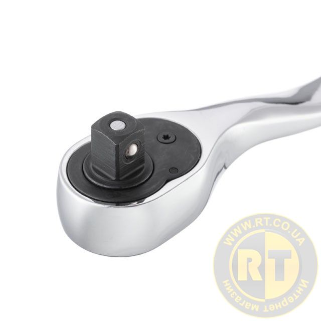 Кнопка у верхній частині тріскачки приводить фіксуючий механізм у дію і ви легко можете міняти головки, при цьому насадки надійно сидять на посадковому квадраті тріскачки та не спадають. Тріскачка з храповим механізмом оснащена зручним прапорцем-перемикачем руху. Вигин ручки дозволяє не зачіпати поверхні інших деталей, які можуть опинитися під ручкою.