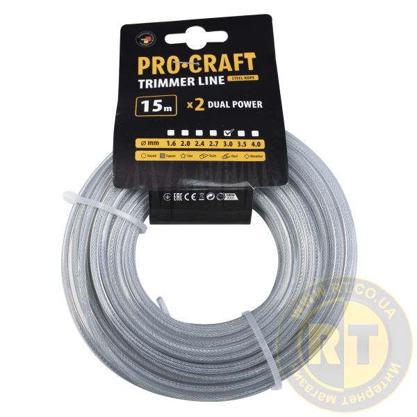 Армована волосінь Procraft призначена для використання в тримерах та мотокосах. Вона ідеально підходить для роботи на великих площах із жорсткою травою та невеликими чагарниками. Завдяки збільшеній міцності та жорсткості, така волосінь не боїться контактів з камінням та твердими стеблами рослин.