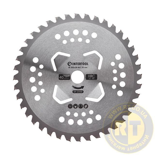 Ніж для мотокоси/тримера з твердосплавними напайками ø255х25.4х1.35 мм 40T, HRC 82-86, 4 підрізні лопаті INTERTOOL DT-2350