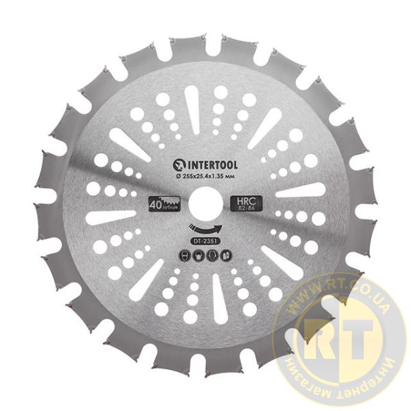 Ніж для мотокоси/тримера з твердосплавними напайками ø255x25.4x1.35 мм 40T, HRC 82-86, двосторонній INTERTOOL DT-2351