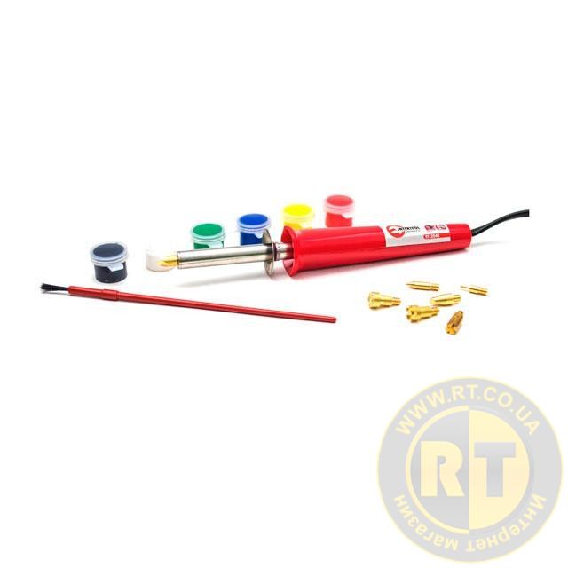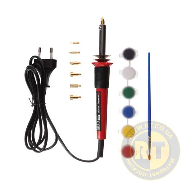 Набір для випалювання RT-2040 — це відмінний спосіб дозвілля, а в деяких випадках, оригінальний метод декору виробів зі шкіри, дерева та деяких інших матеріалів. Електровипалювач являє собою нагрівальний елемент, розміщений в корпусі зі зручною рукояткою. Випалювач RT-2040 — це фактично паяльник контактний, тільки з меншою потужністю (30 Вт).