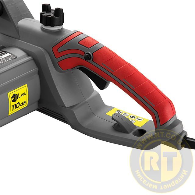 Функція аварійної зупинки реалізована біля передньої ручки - як тільки на неї натискає оператор, спрацьовує захист: зупиняється ланцюг та вимикається живлення двигуна.