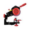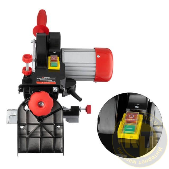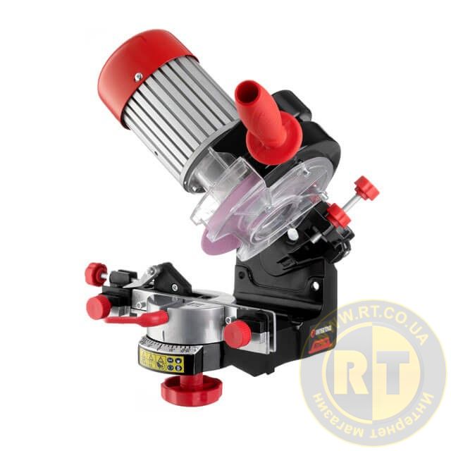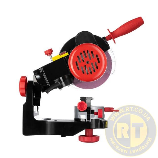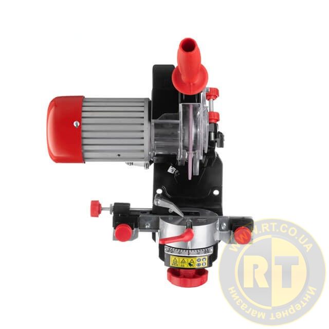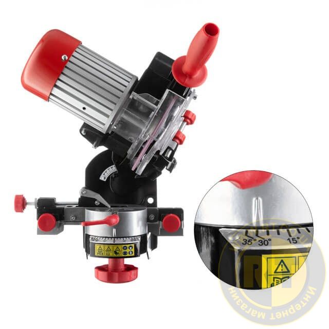 Двигун потужністю 250 Вт розвиває швидкість обертання диска до 7500 об/хв., чого достатньо для ефективного заточування ланцюгів будь-яких типорозмірів електричних та бензинових пилок. Поворотна база з градацією кута повороту дозволить виставити потрібний кут нахилу та забезпечити високу точність роботи. Механізм затиску з обмежувачем особливо зручний для серійного заточування.