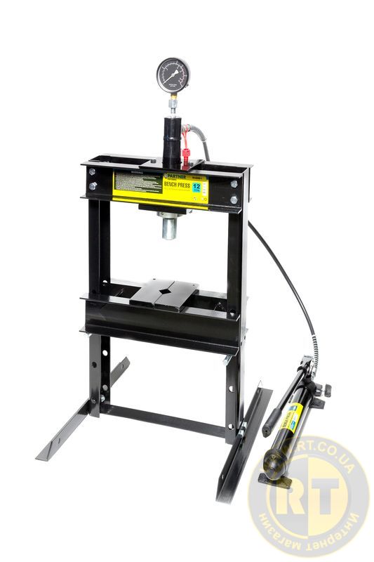 Код товару: 16604 , Склад: Прес настільний гідравлічний з манометром та виносним насосом "Profi", 12т (робоча висота: 0-390мм, робоча ширина: 400мм, робочий стіл: 170х400мм Partner PA-0500