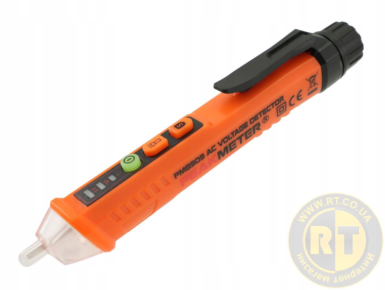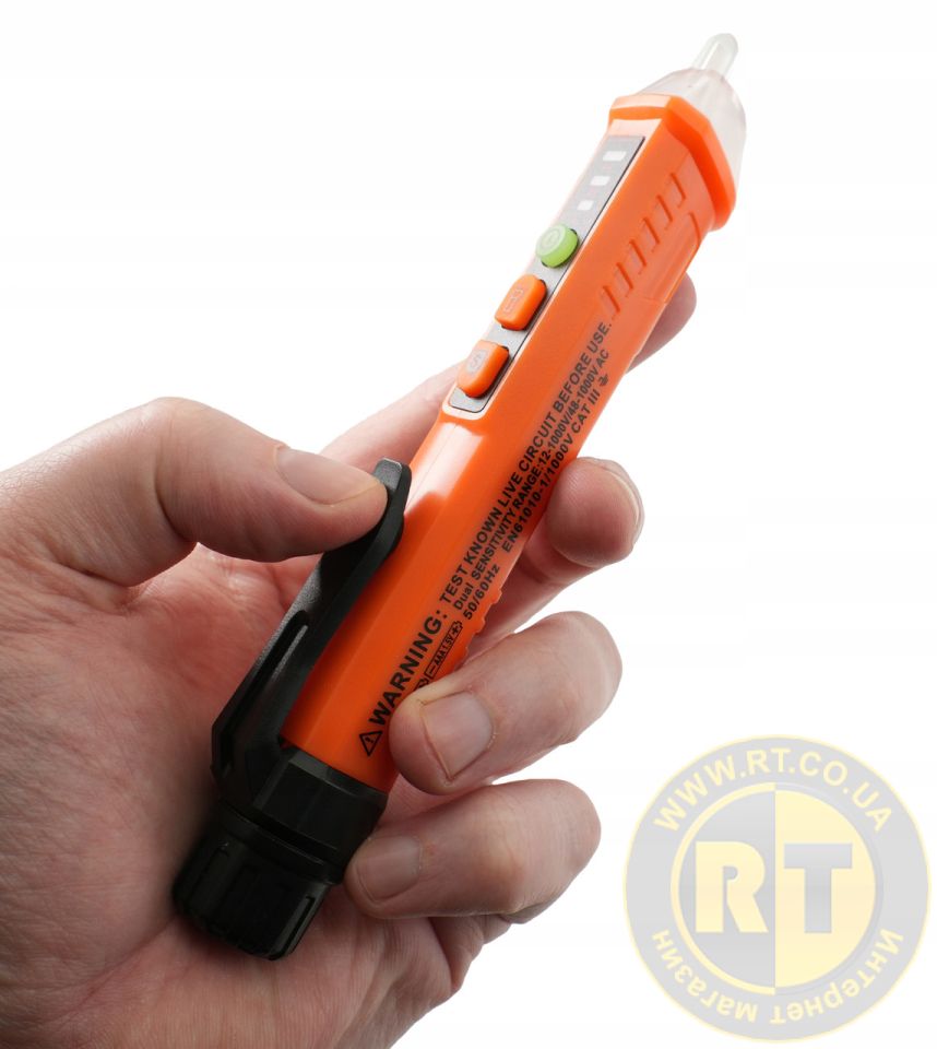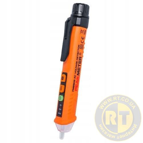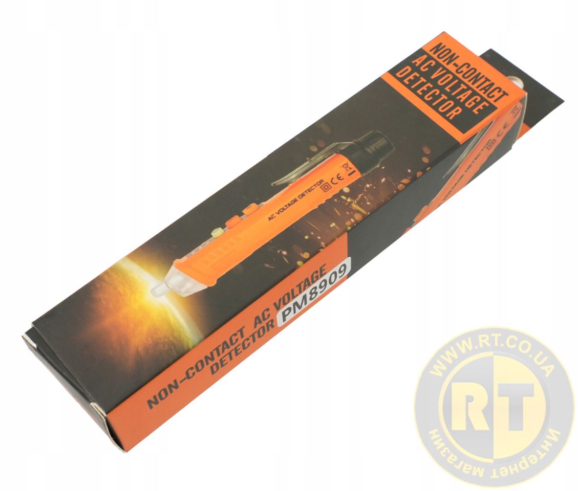 Детектор напруги PROTESTER PM8909 допомагає знайти напругу змінного струму в розетках, подовжувачах, вимикачах, розподільних коробках та кабелях безконтактним способом у двох діапазонах 12-1000 В та 48-1000 В. Мініатюрний і простий у використанні прилад, що сигналізує про наявність напруги, залежно від рівня сигналу, яскравим світлом. Має функцію автоматичного відключення та вимикається після 3-х хвилин бездіяльності. Оснащений спеціальною кліпсою, що дозволяє кріпити детектор напруги на кишеню та має вбудований ліхтарик, завдяки чому може бути застосований для роботи у погано освітлених приміщеннях. Прилад виконаний з міцного пластику і розрахований на тривалу експлуатацію.