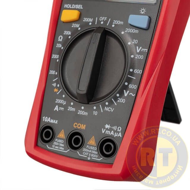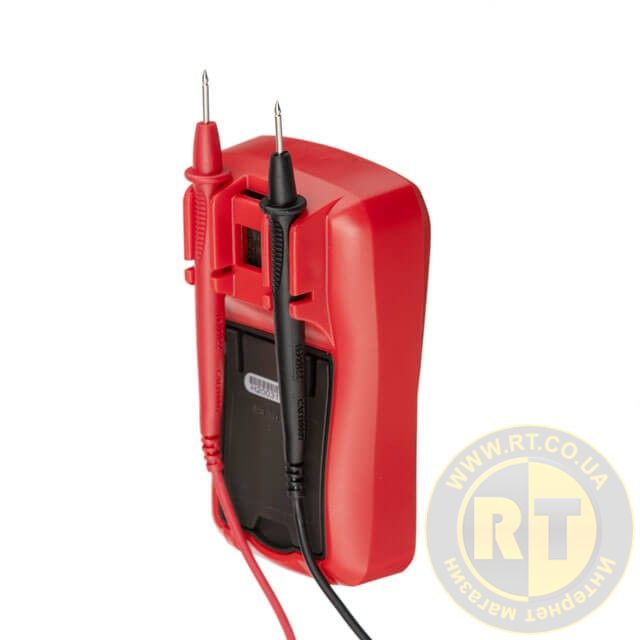 Легкий, компактний корпус мультиметра виготовлено з міцного пластику. Прогумований чохол по периметру корпуса не ковзає в руках і захищає від механічних пошкоджень. Підставка (відкидна ніжка) на задній частині легко відкривається і дозволяє встановити прилад у зручному положенні.