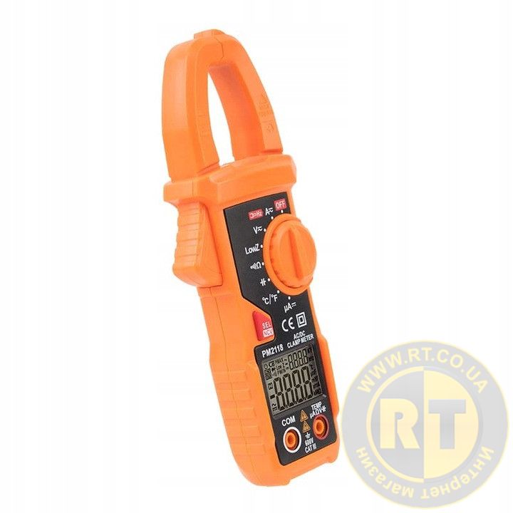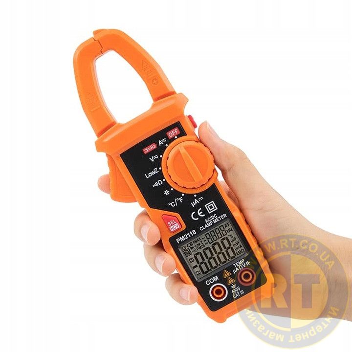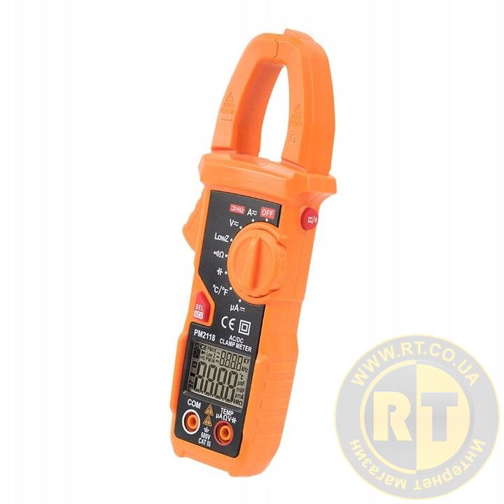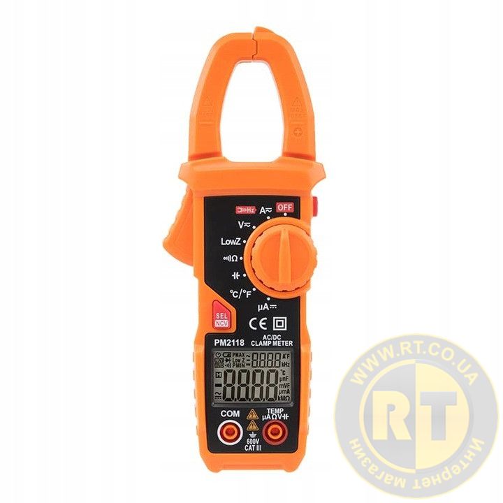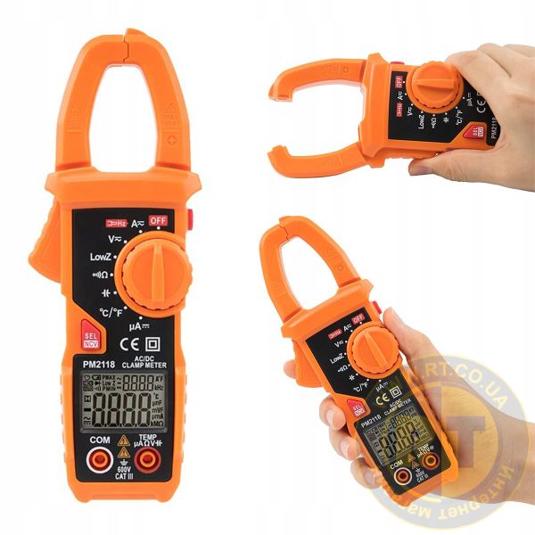 PM2118 - струмовимірювальні кліщі виробництва компанії Protester, призначені для вимірювання постійного та змінного струму до 600A AC/DC (піддіапазони 6А / 60А / 600А), напруги AC/DC до 600В , опору до 10 МОм , ємності до 6 мФ , цілісності ланцюга зі звуковою індикацією.