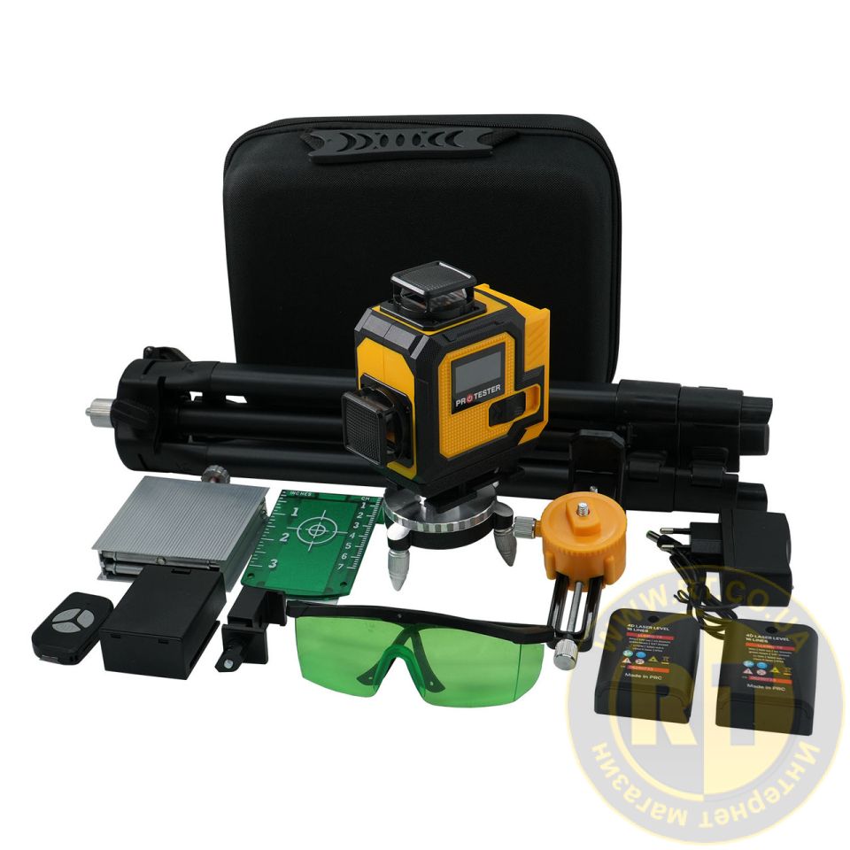 Лазерний рівень 16 ліній 4D (2xH360/2xV360, LCD-дисплей, пульт ДК + ШТАТИВ - зелений промінь) PROTESTER LL616G-TR