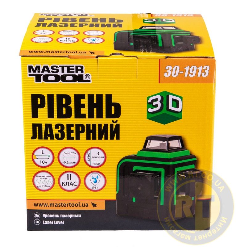 Рівень лазерний 10 м ±0.2 мм/м 3 гол H/V/H+V H360°/2хV360° ±3° GREEN/510 нм клас II IP54 Li-ion/ААх3 сумка MASTERTOOL 30-1913
