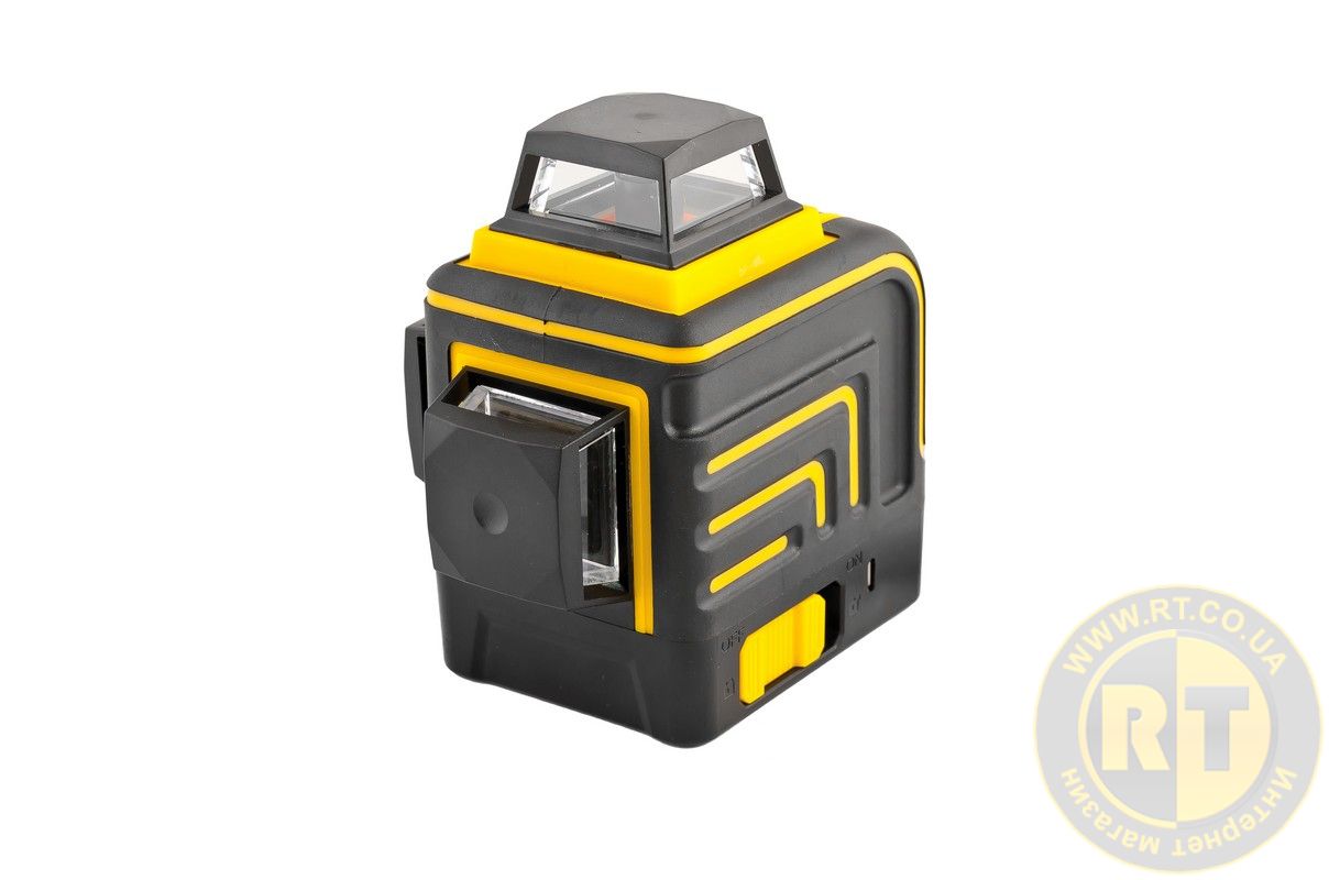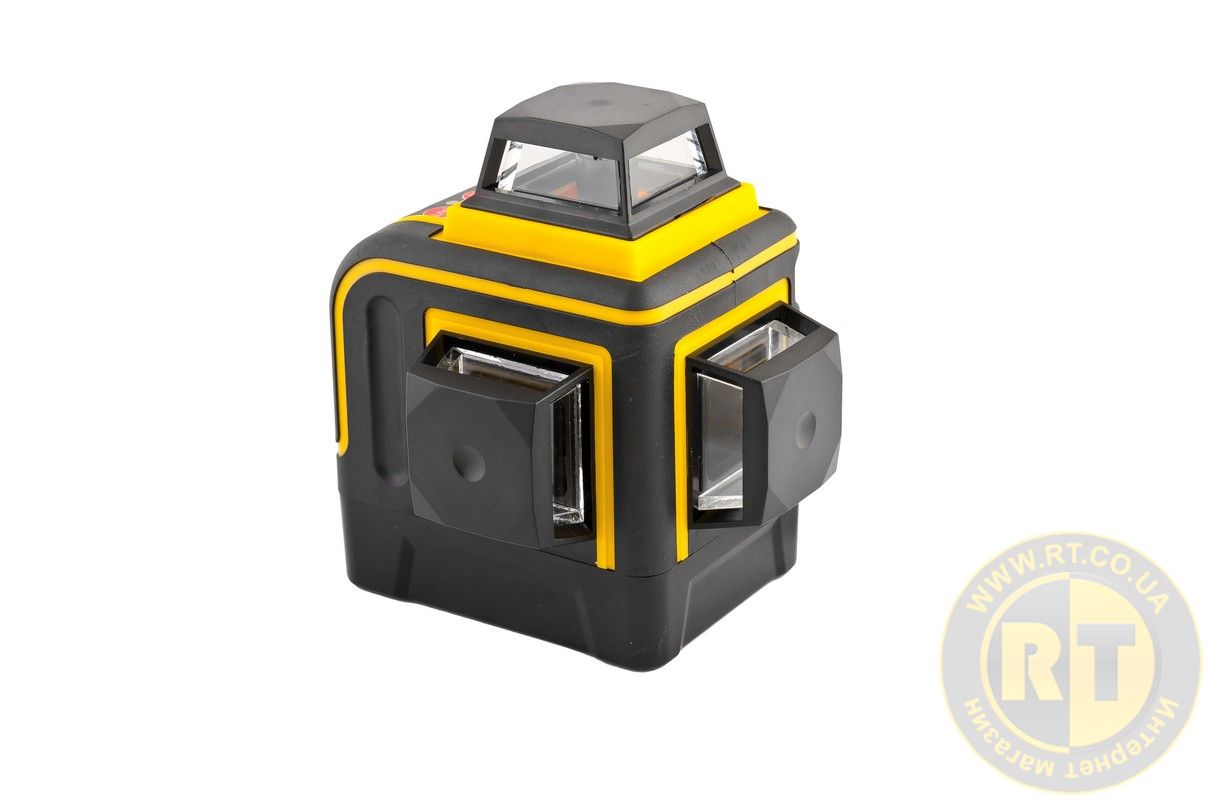 Професійний лазерний рівень із трьома лазерними головками, що формують повну кругову горизонталь та дві вертикальні площини на 360°, забезпечуючи максимальне покриття для точної розмітки у будь-якому напрямку.
