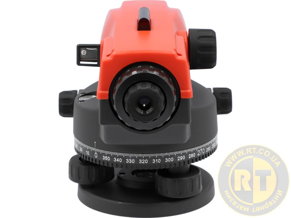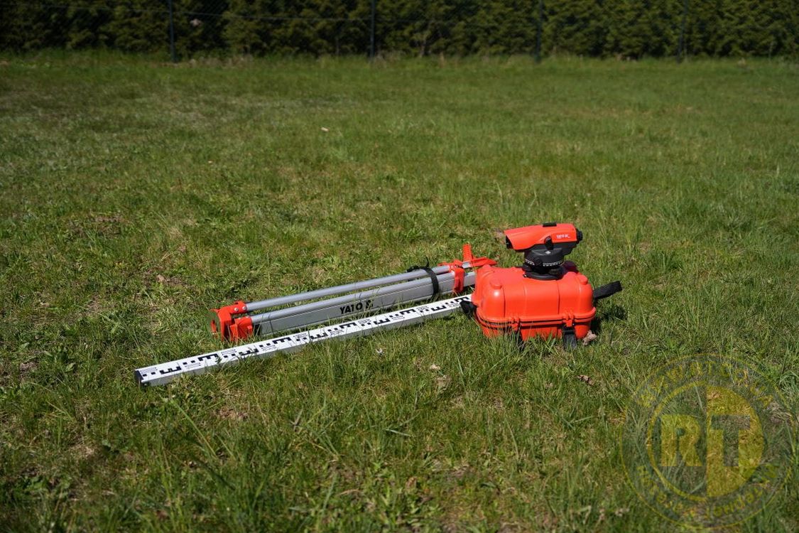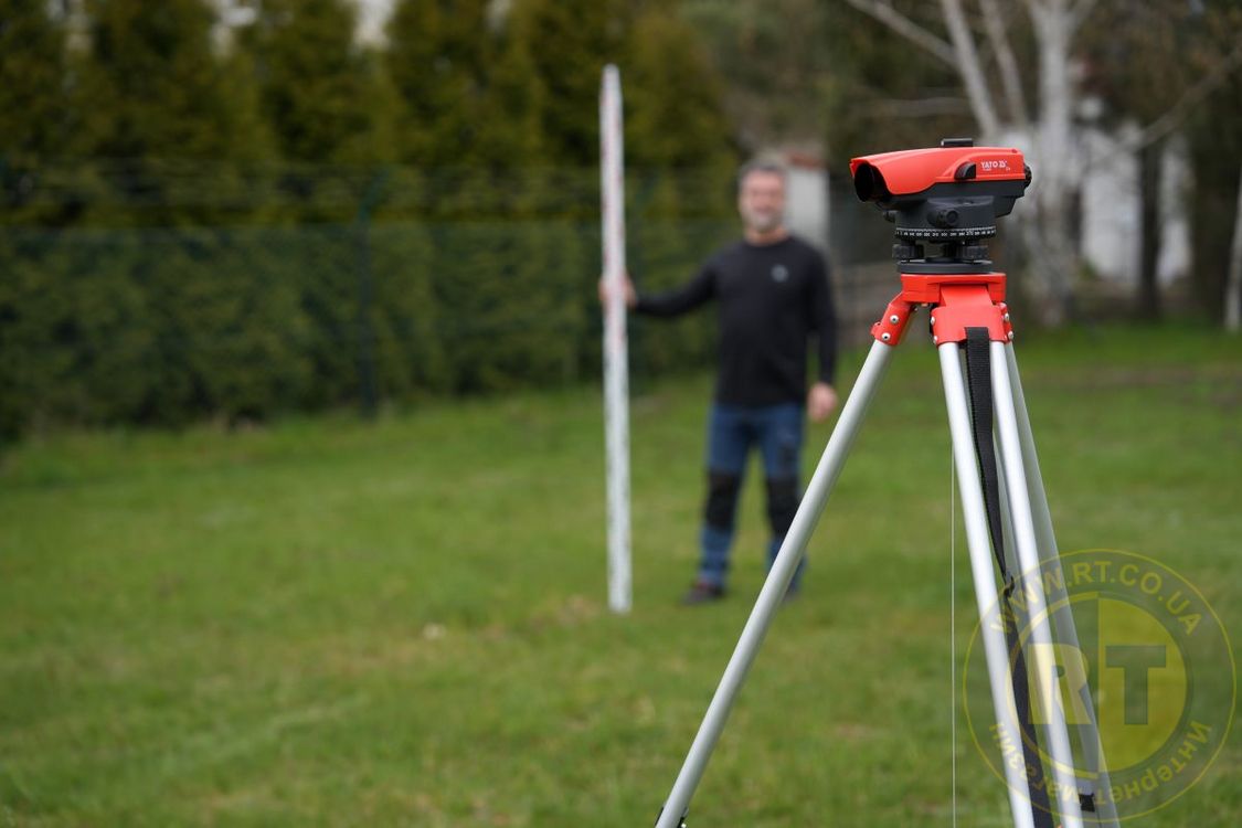 Оптичний нівелір для геодезії та будівництва в комплекті зі штативом та 5-метровою геодезичною рейкою.