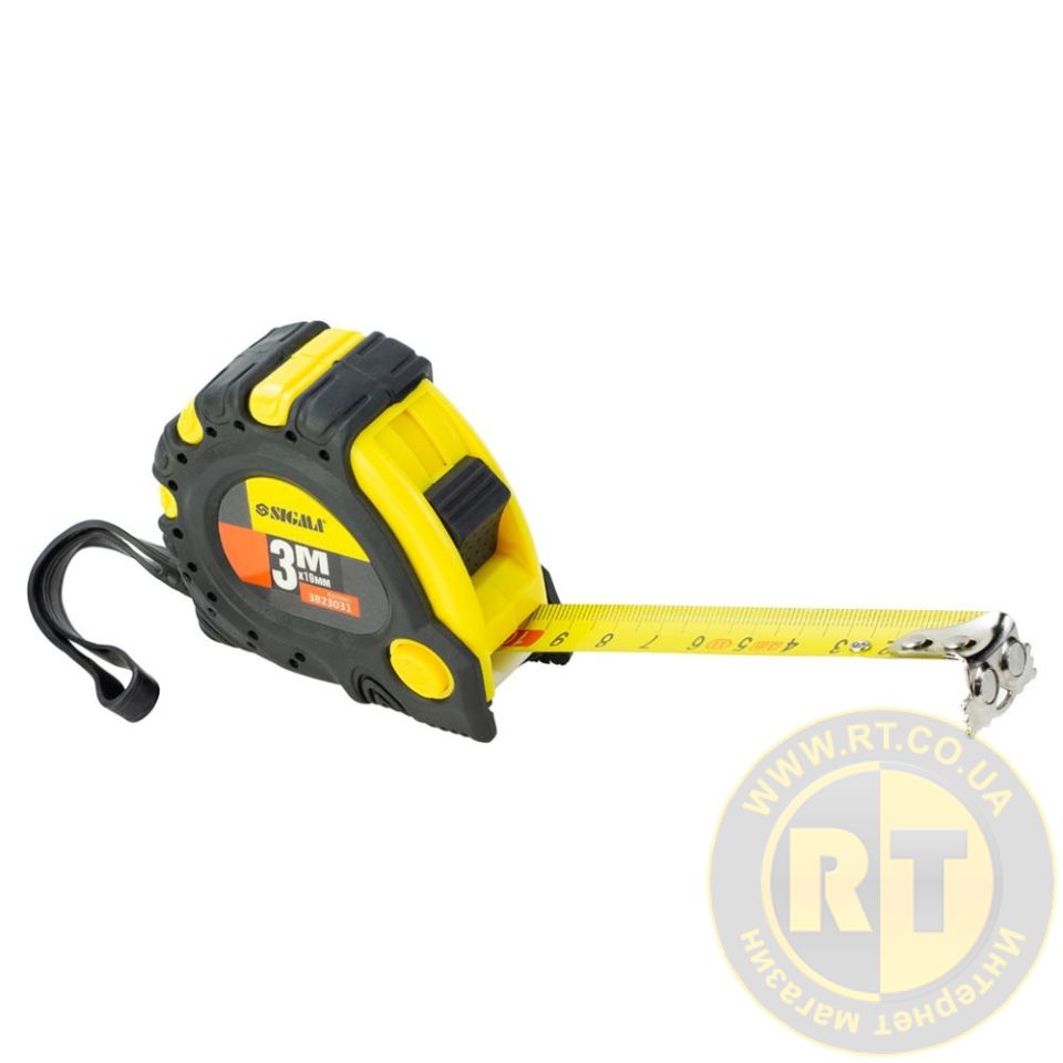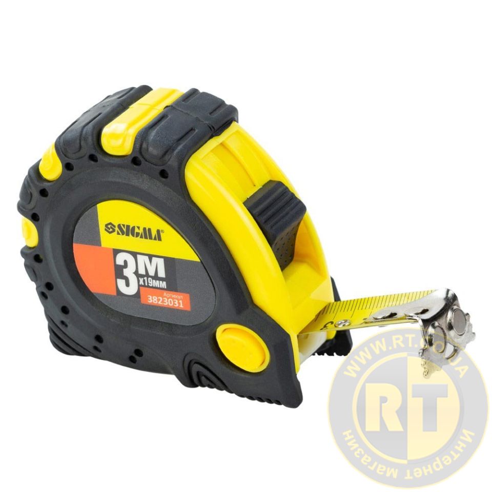 Рулетка магнітна гумова JT фіксатор+гальмо 3м×19мм SIGMA (3823031) функції гальма та блокування виконуються окремими кнопками.